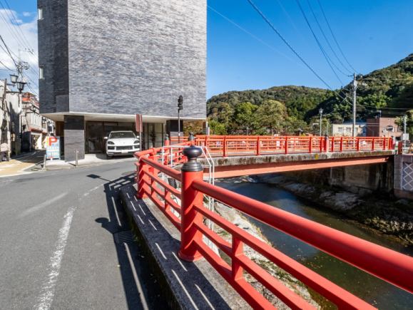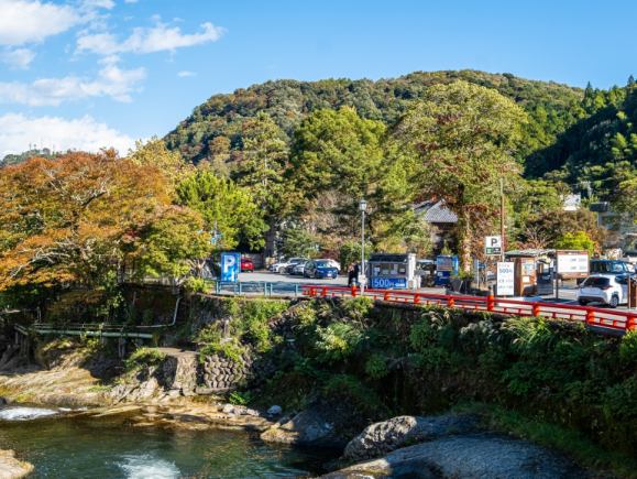 As you enter the hot spring town from the bus stop, you will see the red Togetsukyo Bridge spanning Kano River River. - ②