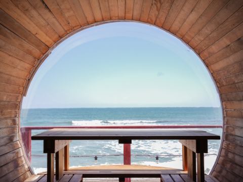 뛰어난 전망을 자랑하는 온욕 시설 「유캇페 병설한 글램핑 시설입니다.