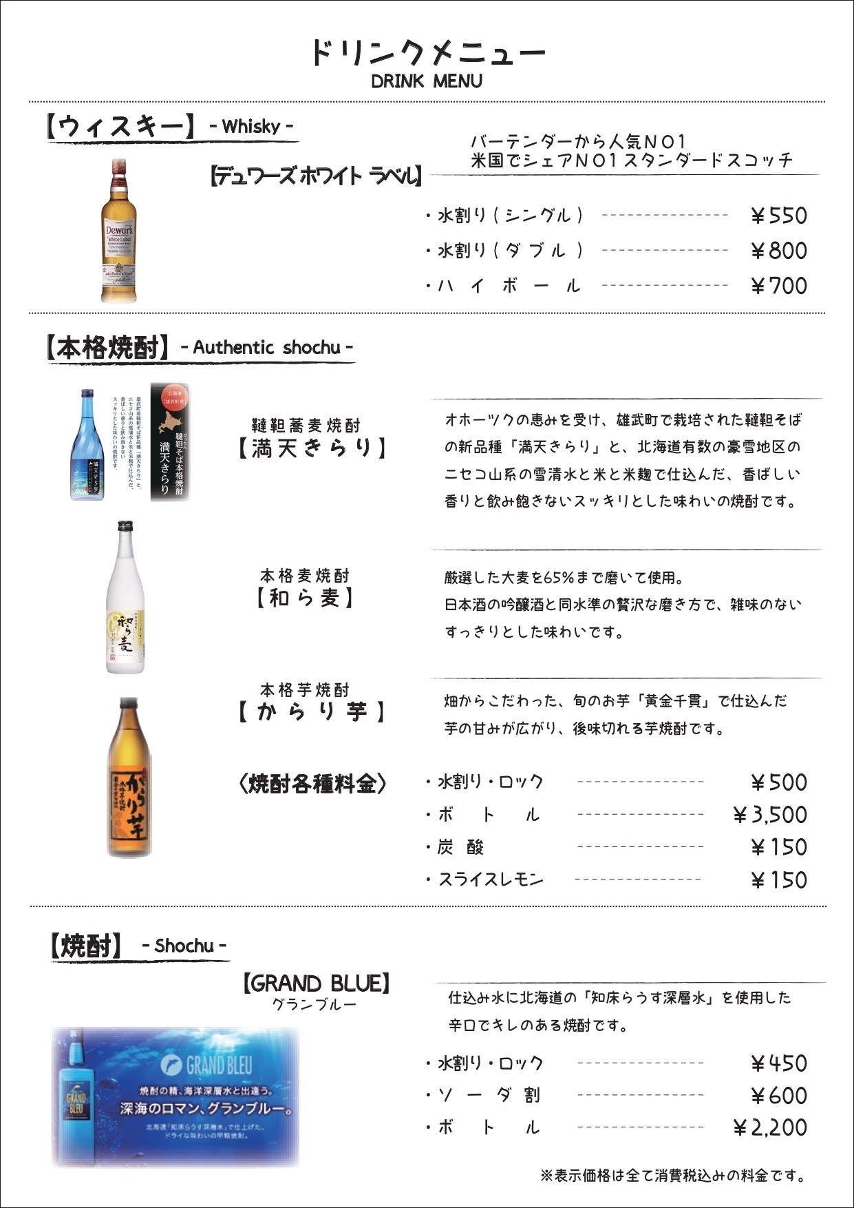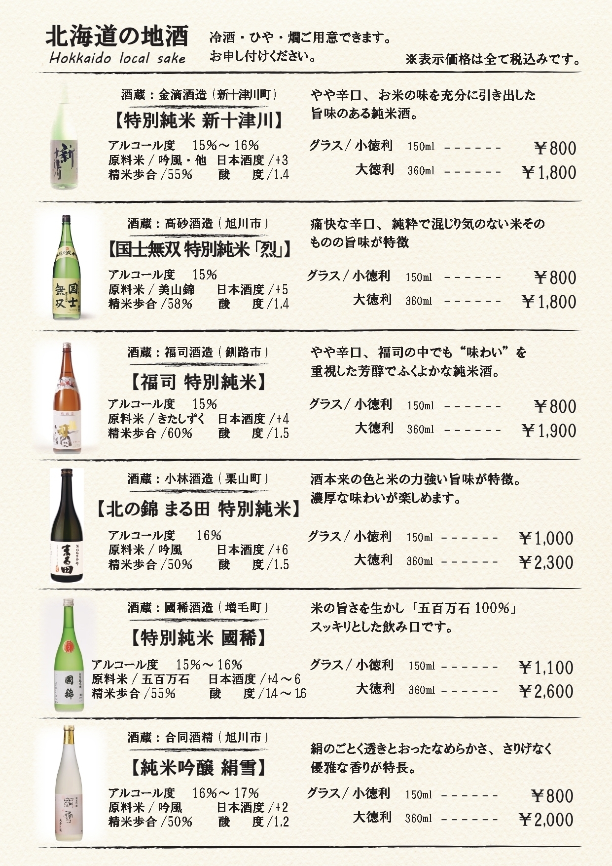 털게와 가을 연어 브랜드 '메지카' '유보', 가리비, 이쿠라, 오무규 소고기 닷탄 메밀 등 풍부한 식재료가 매력입니다. 에조바훈 성게는 어기가 짧기 때문에 매우 귀중한 것입니다. 양질의 다시마(리시리 다시마)를 충분히 먹고 자란 그 맛은 각별! 성게의 맛을 해치지 않고 봉쇄한 소금물 팩의 생 성게를 밥과 함께…말이 되지 않습니다. 또한 가리비 조개와 훅 조개, 고구마 조개는 굽고 좋고 생으로 좋다. 사시미・버터구이・샤브샤브・카르파쵸등 어떤 먹는 방법이라도 OK입니다. 「오무쵸 의 맛」을 즐겨 주세요.