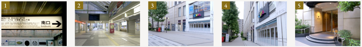 【도보 안내】 ① 신유리가오카 역 을 남쪽 출구로 갑니다. ② 남쪽 출구를 향해 왼쪽으로 진행합니다. ③ 신유리가오카 역 의 남쪽 출구를 나와 왼쪽으로. ④ 신유리가오카 역 의 남쪽 출구 왼손의 산책길을 진행합니다. ⑤ 호텔의 서브 입구입니다.
