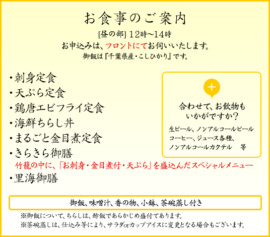 プラン詳細 | ●昼食は選べる定食 ●夕食は磯会席料理 ●おやつに無添加・地アイス「すっぴんアイス」付 ●お食事会場は当日の状況により、二つの会場のどちらかでご案内させていただきます。(当日のチェックインの際にご案内いたします。) ●お部屋のお布団、内風呂については別途料金となります。 |