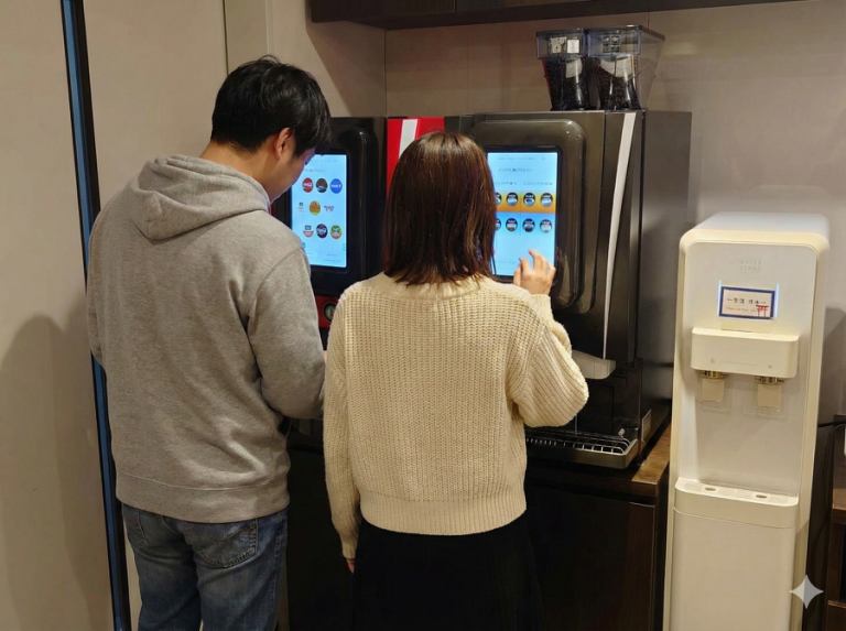 二楼休息室安装了一台可口可乐饮料自动售货机。…