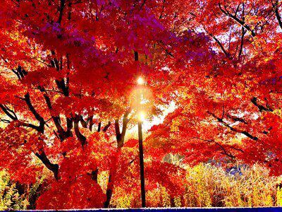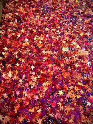 朝霜に濡れて枯れる前の落ち葉の絨毯の彩りもまた素敵な紅葉狩りです。