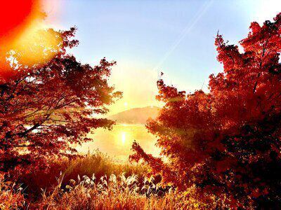 河口湖紅葉祭り、奥河口湖の紅葉はまだまだ楽しめます、そして只今の日の出は6時45〜48分!