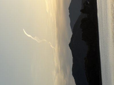 早朝のお散歩RUNより、湖の上に光る一筋の雲 龍が如く!