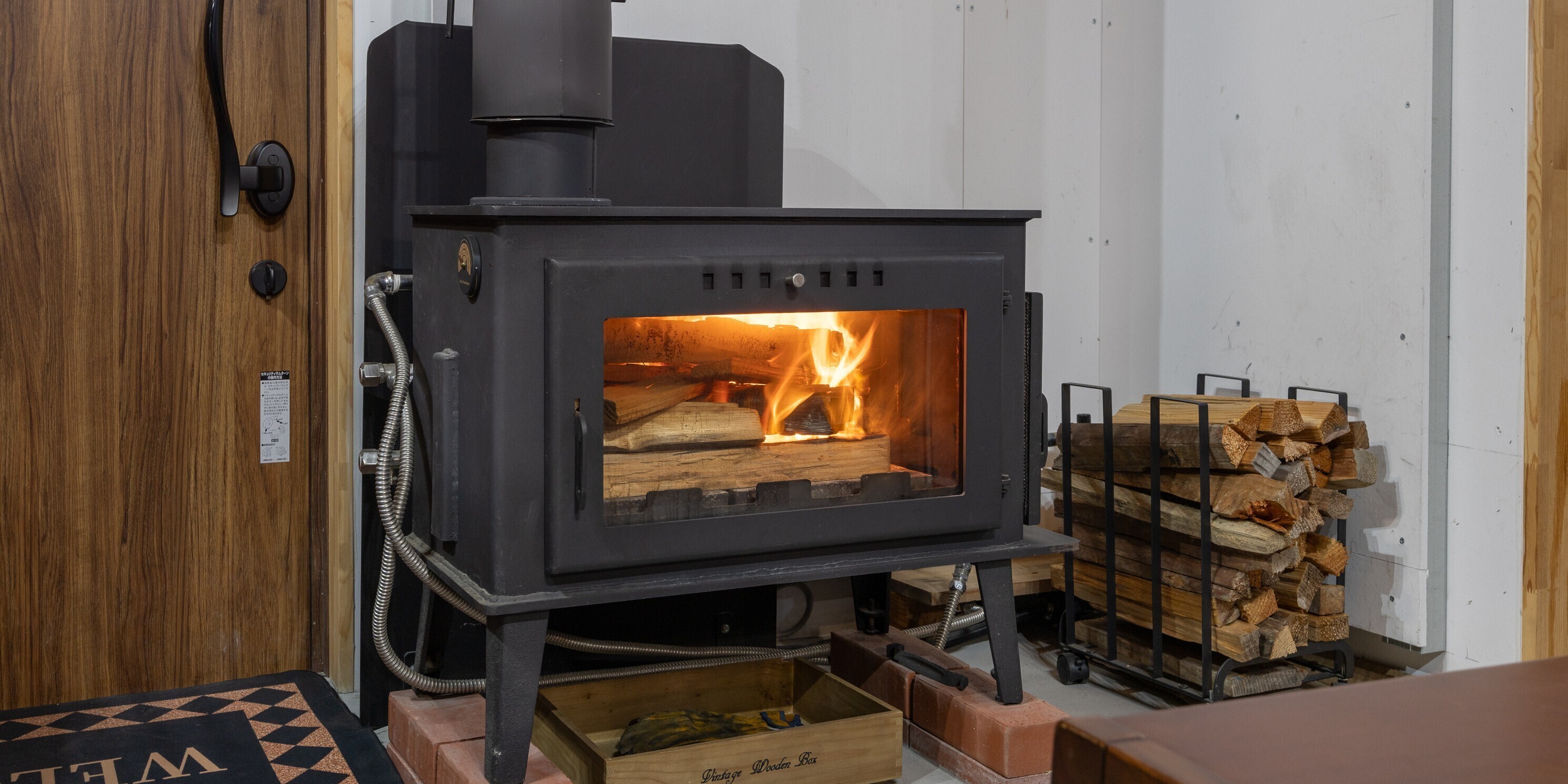 玄関を入ると薪ストーブのある広い土間になっていて、薪ストーブ(冬季のみ)の炎の揺らぎは至福の極み。