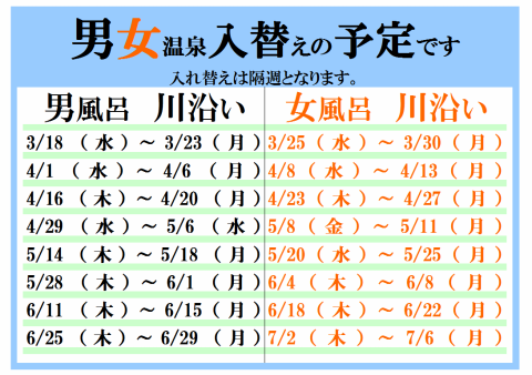 토요일 | 실버 데이(65세 이상의 연령 증명 제시로 400엔으로 입욕할 수 있습니다.) |