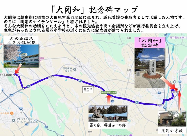 見上愛さん演じる主人公、「一ノ瀬りん」のモデル、大田原市出身看護師「大関和」記念石碑