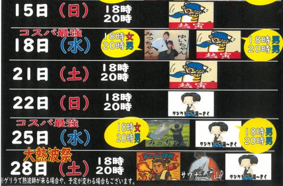 日帰り温泉館「太陽の湯」熱波師情報当館専属熱波師や盛り上げてくれる熱波師の方々の