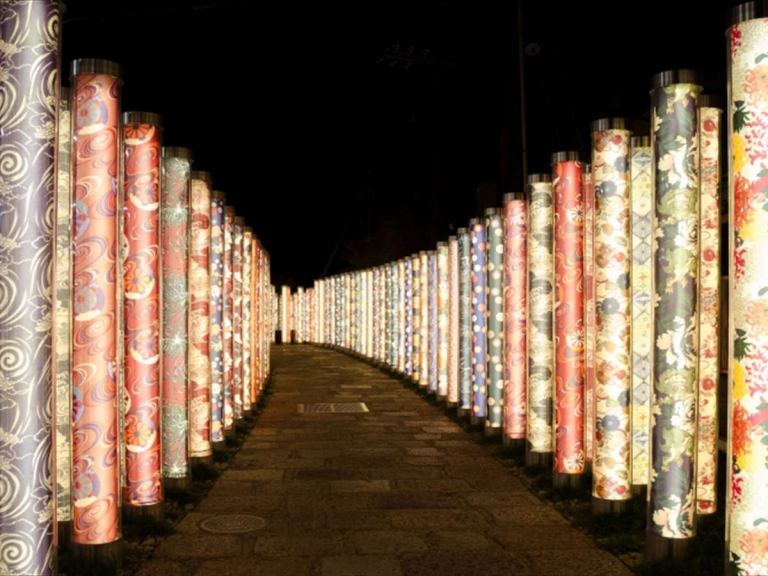 嵐電嵐山駅ホームの京友禅の林「キモノ・フォレ…