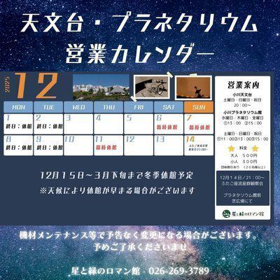 小川天文台、プラネタリウム館の営業日のお知らせ