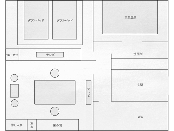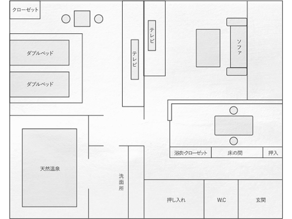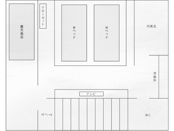 | 備品 | 專屬浴袍 / 冷水 / 棉花棒 / 女性乳液 / 浴巾 刮鬍刀 / 梳子 / 牙刷 / 髮帶 / 化妝棉 |