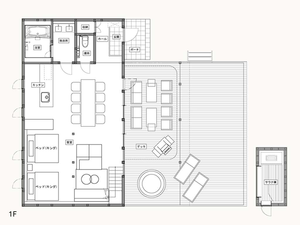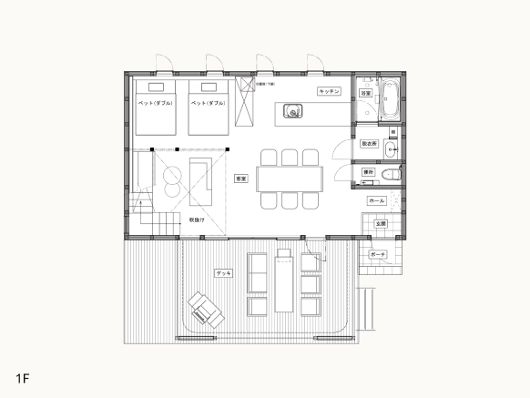 객실 설비‧비품 | 목욕 / 서양식 화장실 / 부엌 / 독립 세면대 / 더블베드×2/이불×3/다다미 공간/ 실내 식탁 / 실내 다이닝 의자×6 / 실내 소파/ 실내 소파 테이블 / TV / 에어컨 / 냉동 냉장고 / 가습 공기 청정기 / 프로젝터 / 드라이어 / 전기 주전자 / 휴대용 램프 / 2구 버너 스토브 / 다이닝 데크 테이블 / 다이닝 데크 소파 / 다이닝 데크 의자 × 4 / 다이닝 사이드 테이블/ 다이닝 사이드 의자 / 티피(모닥불)/ Wi-Fi |