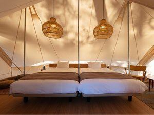 テントの中もシンプルでスタイリッシュに整っております。まるでホテルの様にゆっくり寛げます。