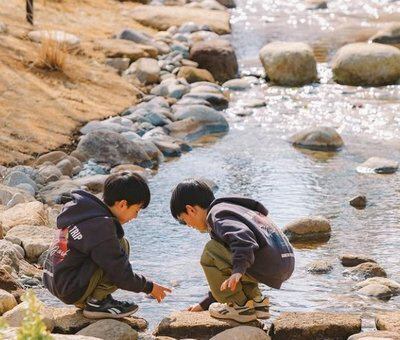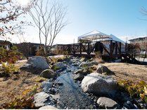 施設内には小川が流れており、温かい季節には水遊びも楽しめます。