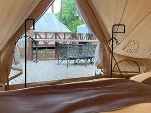 ノルディスク製のテントでのんびり、バーベキューやお食事は必ずテラスの様にウッドデッキがありますのでそちらでお楽しみ頂けます。煙の臭いなども気になりません。