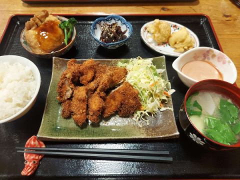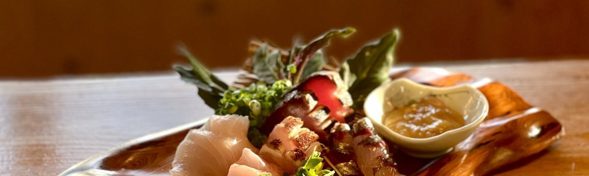 屋久岛是日本鱼类种类最丰富的岛屿之一。我们提供刺身套餐,包含 3 至 4 种鱼类,主要是店主捕捞的或当天早上在当地市场捕捞的鱼类,盛放在屋久杉木制成的盘子中。包括米饭、味噌汤和 3-4 道小菜。(每天可买到的鱼的种类都不一样。)