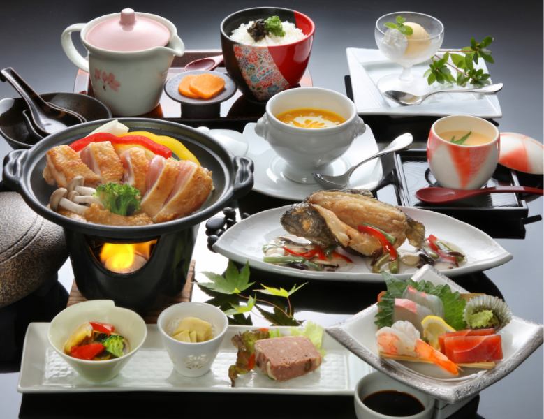 Appetizers | Bamboo shoots with young leaves, seasonal simmered vegetables, pate de company, Hakata chicken jibuni, sakura mochi, country konjac |