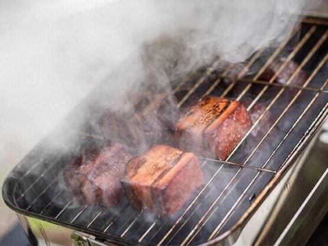 Snow Peak 의 "컴팩트 스모커"를 사용하여 만드는 "가라쓰 군 연기 공방"의 아라비키 스테이크, 견과류와 치즈의 훈제 체험을 "아사쿠라"의 음료 비교와 함께 즐길 수 있습니다. 후쿠오카현 아사쿠라시의 노포 주조·시노자키가, 보리 소주를 키타루로 장기 숙성시켜 만든 리큐어. "아사쿠라" 마치 위스키 같은 맛의 "아사쿠라"는 훈제와 궁합이 뛰어납니다.