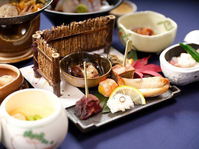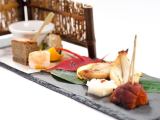 焼八寸 | 河豚柚庵焼き 干し柿松葉 菊花大根 秋刀魚有馬煮 黒豆軽羹 牡蠣味噌柚子釜 黄身寿司 |